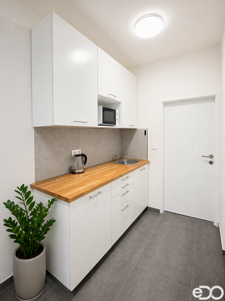 K dispozici je sdílené sociální zázemí a vybavená kuchyňka v domě. Objekt je obsazen dalšími solidními nájemci, což vytváří klidné a profesionální prostředí.
