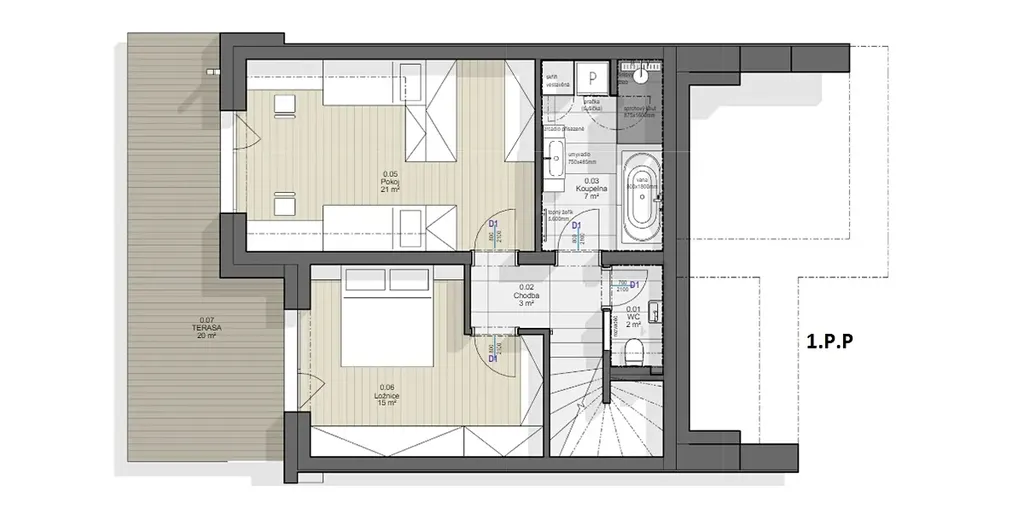 V 1.P.P jsou dvě ložnice se šatnami, koupelna a WC. Na ložnice navazuje terasa orientovaná jihovýchodním směrem do zahrady s výhledem na les.