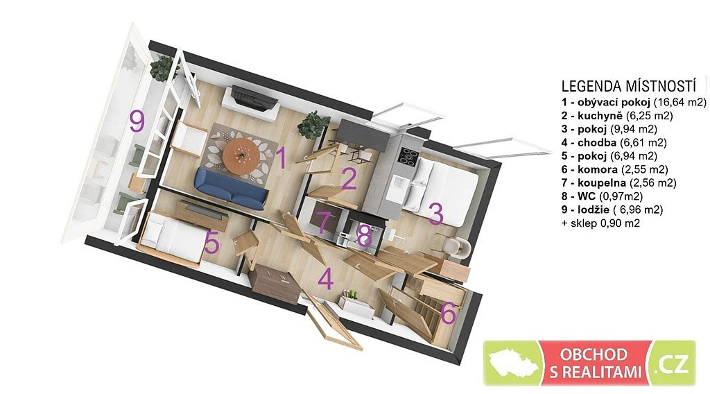 Výměra bytové jednotky je 52,46 m² + sklepní kóje 0,9 m² + lodžie 6,96 m². Byt je v původní stavu, dispozici bytu nelimitují stěnové panely, neboť dispozice uvnitř bytu je tvořena nenosnými deskami a umakartovým jádrem. Stávající dispozici bytu přikládáme. Byt se nachází v nejvyšším 8. podlaží (sedmém patře).