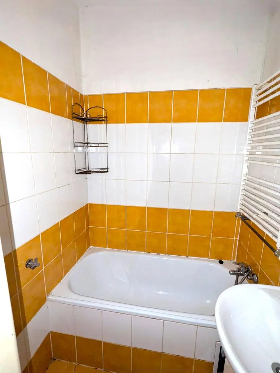 Koupelna obložena obklady, vybavena vanou a umyvadlem. WC odděleno.
