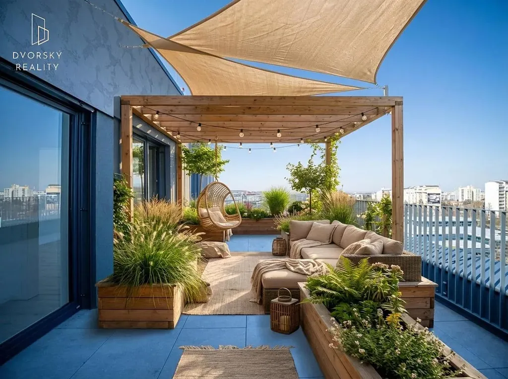 Velkým benefitem je terasa, která otevírá další rozměr bydlení. Je zde připravena kompletní infrastruktura pro instalaci vířivky (400V, statické posouzení až 500 kg/m²), včetně přívodu vody s nezámrzným kohoutem. Prostor tak nabízí ideální zázemí pro relaxaci i společenské chvíle.
