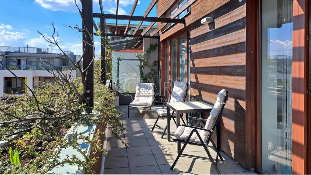 Byt o celkové ploše 76,14 m² (56,18 m² byt + 19,96 m² terasa) se nachází v moderním domě se solárními panely a zaujme světlým, vzdušným interiérem s dřevěnou podlahou a příjemnou atmosférou doplněnou zelení.