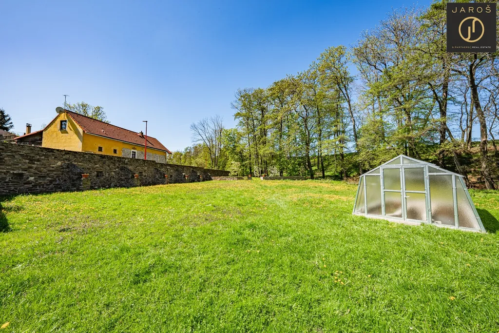 Pozemek o celkové ploše 5209 m² zahrnuje zahradu o výměře 4332 m² se skleníkem, vyvýšenými záhony a vzrostlými stromy. V zadní části zahrady protéká potok a nově vybudovaná kamenná zeď zajišťuje příjemné soukromí.