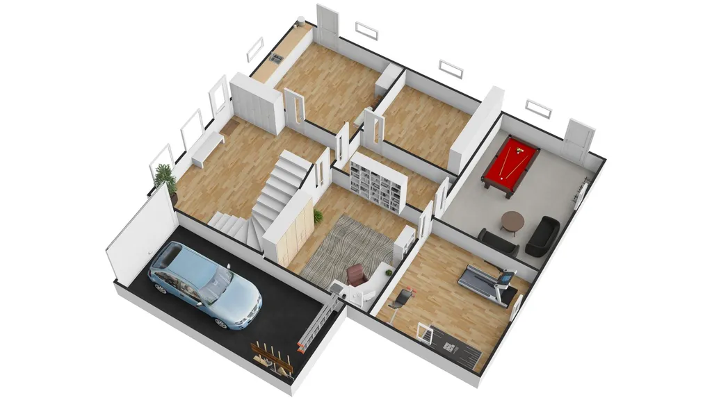 1. NP: vstupní hala, letní kuchyně, technická místnost, dílna, úložná spíž velká, sklep, garáž pro jedno vozidlo a kousek od domu druhá garáž pro jedno vozidlo