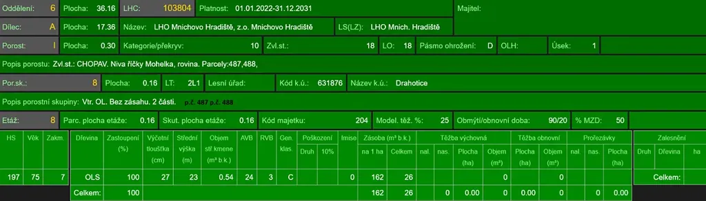 - p.č. 487 vedená jako lesní pozemek o celkové výměře 1 813 m2 (stáří lesa 79 let - zastoupení dřevin olše, stáří lesa 24 let - zastoupení dřevin střemcha, olše, buk),