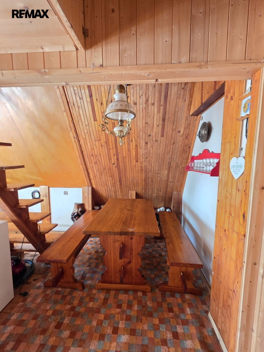 Obytná část objektu nabízí prostornou společenskou místnost s krbem, kuchyňský kout a koupelnu s vanou a toaletou. Ze společenské místnosti je vstup na