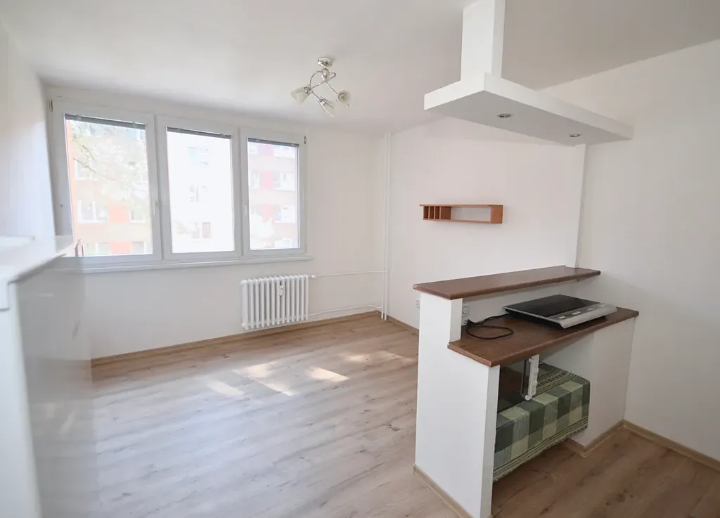 Nabízíme pronájem pěkného bytu 1+kk o výměře 23 m², v 1 patře panelového domu. Pokoj je vybaven kuchyňským koutem, el. deskou, mikrovlnou troubou a lednicí. Koupelna se sprchovým koutem a WC.