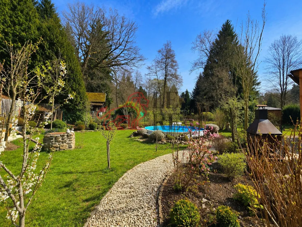 Součástí je krásná udržovaná zahrada s venkovním krbem, studnou a polozapuštěným bazénem.