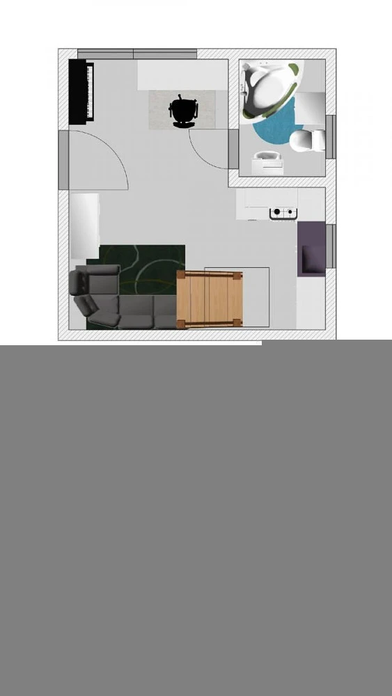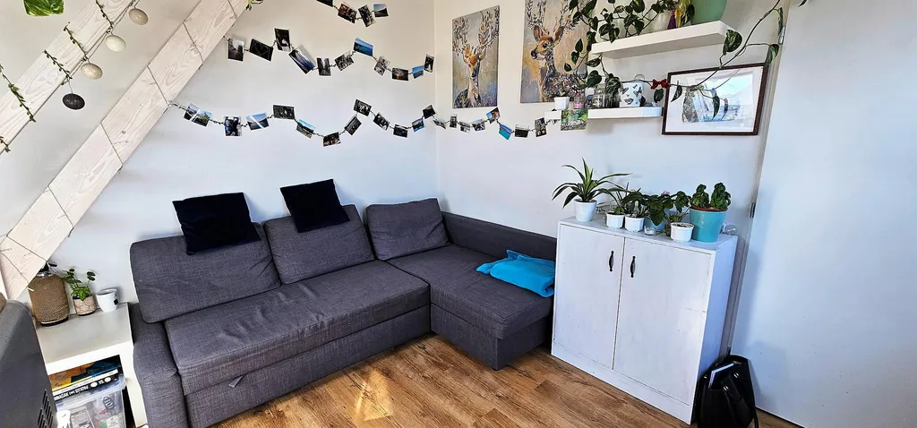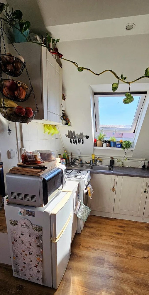 Bytová jednotka se nachází v posledním patře bytového domu. Na patře se pouze tento byt. Vstupními dveřmi vejdeme do bytu, kde nás přivítá místnost do tvaru L o výměře cca 15 m². Místnost je obývací pokoj s kuchyní, zároveň slouží jako pracovna a odpočinková část bytu. Koupelna je prostorná, její výměra je cca 3,5m². Je zde WC, rohová vana a umyvadlo. Díky střešnímu oknu je místnost krásně prosvícená denním světlem. Kuchyň je na míru a vypadá moc pěkně. Pomocí dřevěného schodiště vejdeme do mezonetu o celkové ploše cca 7,8m², který slouží jako úložný prostor a zejména spací část.