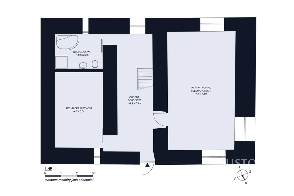 • přízemí: velká technická místnost, koupelna, obývák/světnice