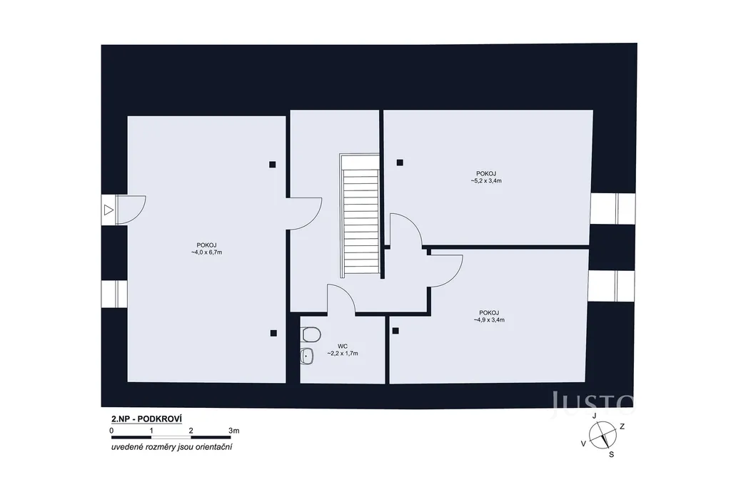 • podkroví: 3 samostatné neprůchozí pokoje, toaleta