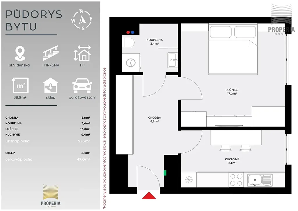 Pronájem nově zrekonstruovaného bytu 1+1 se sklepem a garážovým stáním.