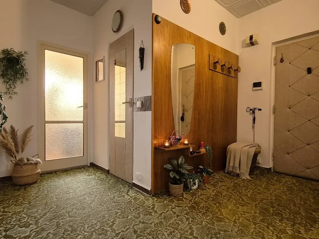 Byt o celkové ploše 73,62 m² se nachází v 9. nadzemním podlaží panelového domu s výtahem. K bytu náleží balkon o velikosti 2,25 m² orientovaný na jihozápad – ideální místo pro odpočinek. Součástí je také sklepní kóje v suterénu domu (1,99 m²).