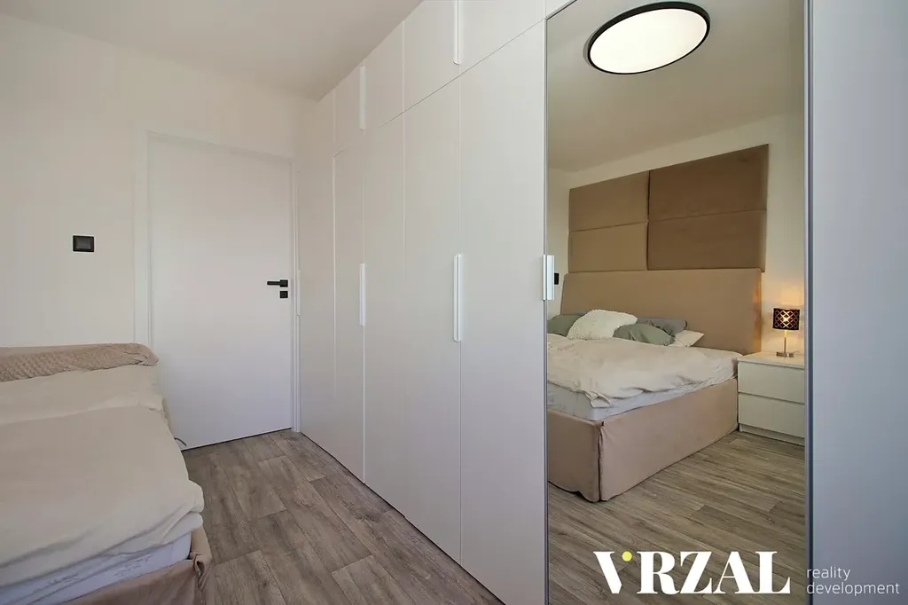Byt se skládá z obývacího pokoje s hezkým výhledem do okolní přírody, odkud je přístup do velkého dětského pokoje. Ze vstupní chodby je přístupná kuchyně s na míru vyrobenou kuchyňskou linkou a vestavnými elektrospotřebiči – lednice s mrazákem, myčka, el. trouba, mikrovlnná trouba, digestoř a nechybí ani granitový dřez s baterií. Také pračka je šikovně umístěna v kuchyňské lince. Z chodby je přístup dále do ložnice, kde se nachází velká na míru vyrobená vestavná skříň. Koupelna s vanou je oddělena od toalety, která je samostatná. I díky prostorné šatní skříni v chodbě byt nabízí dostatek skladovacích prostor.