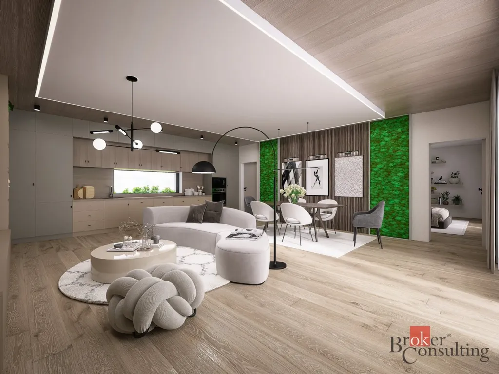 - prostorný obývací pokoj s kuchyňským koutem (42,5 m²) a vstupem do technické místnosti