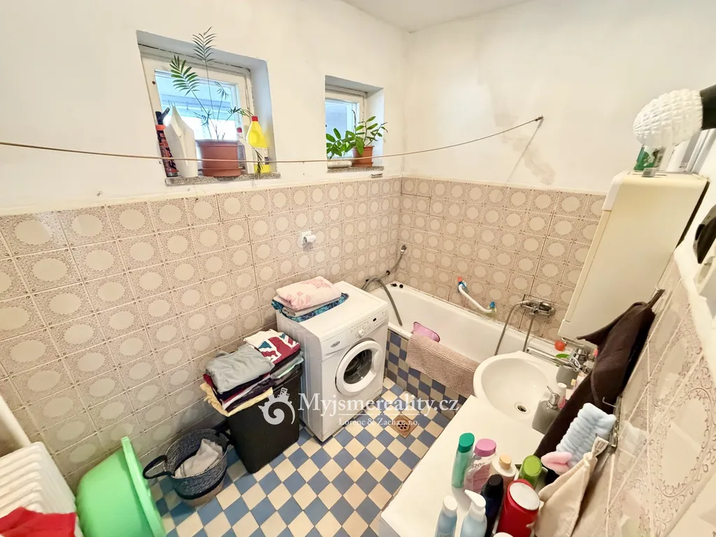 Další místností je kuchyň za kterou najdeme koupelnu s vanou, umyvadlem a přípojkou na pračku.
