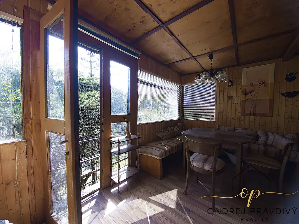 V horní části pozemku se nachází menší dřevěná chata s velmi hezkým posezením.