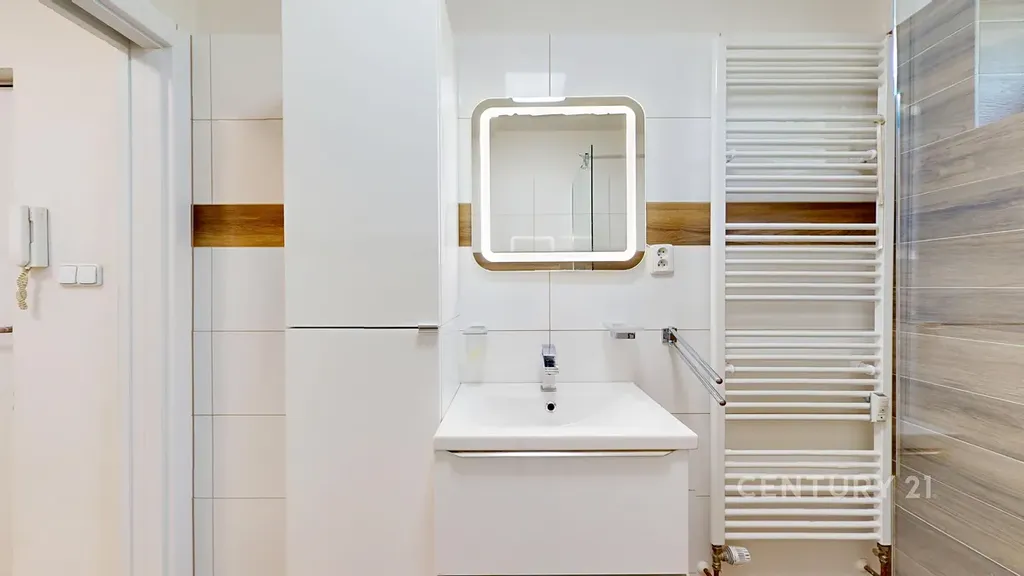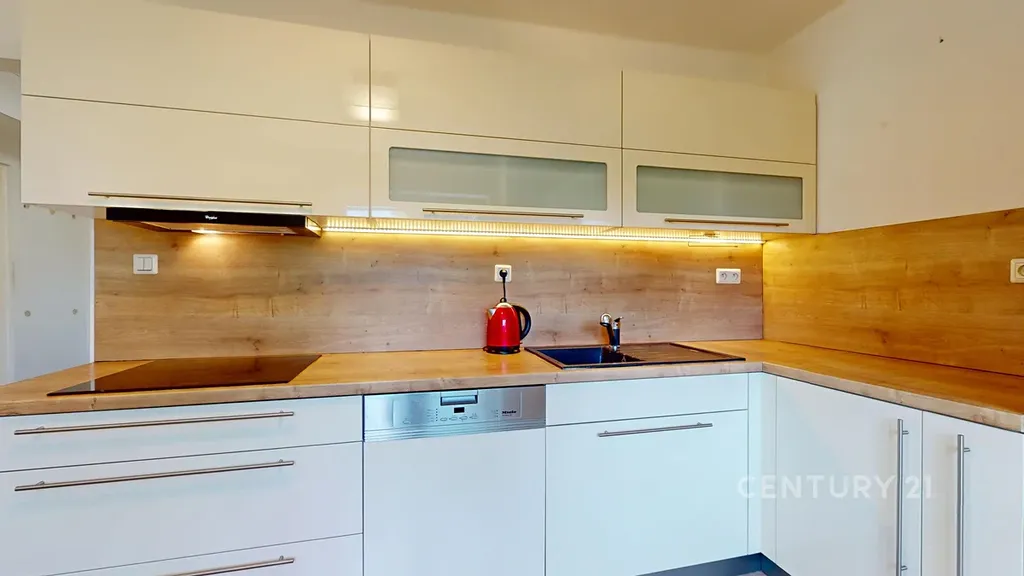 Byt je po čerstvé rekonstrukci – najdete zde novou koupelnu s walkin sprchou a elektrickým sušákem ručníků, moderní kuchyňskou linku, která byla vyrobena na míru je vybavena sklokeramickou deskou, digestoří, zabudovanou myčkou značky Miele a vestavěnou lednicí s mrazákem. Největší předností je opravdu velký balkon, ideální pro posezení, pěstování bylinek nebo relax s knihou.