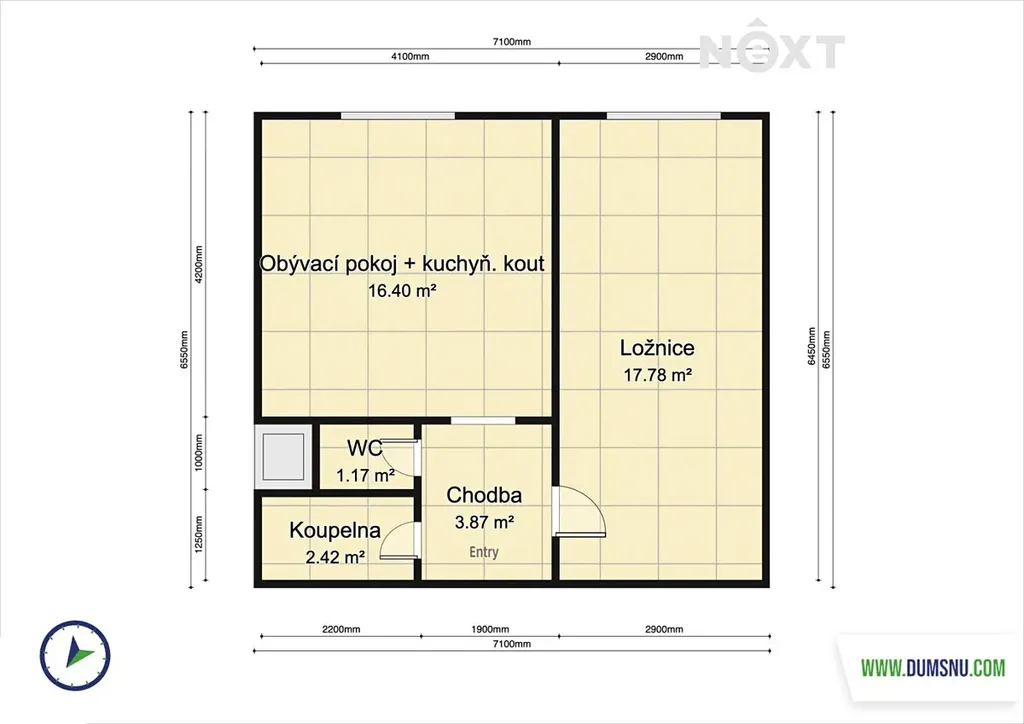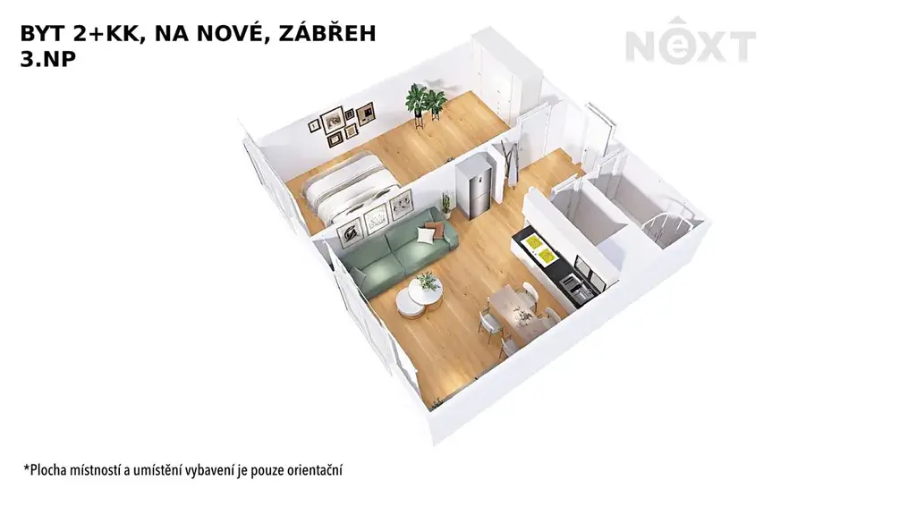 Dispozice bytu zahrnuje obývací pokoj s kuchyňským koutem, samostatný neprůchozí pokoj, předsíň, koupelnu se sprchovým koutem a samostatnou toaletu.