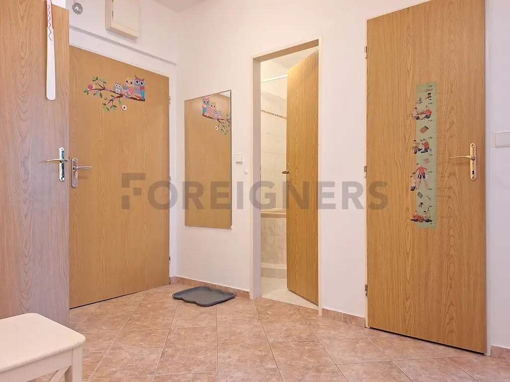 Jako první vejdete do předsíně. Předsíň je prostorná a nabízí vstup do všech místností v bytě. Z předsíně můžete pokračovat do ložnice, obývacího pokoje či kuchyně. Samozřejmostí je toaleta a koupelna. V bytě je také komora.