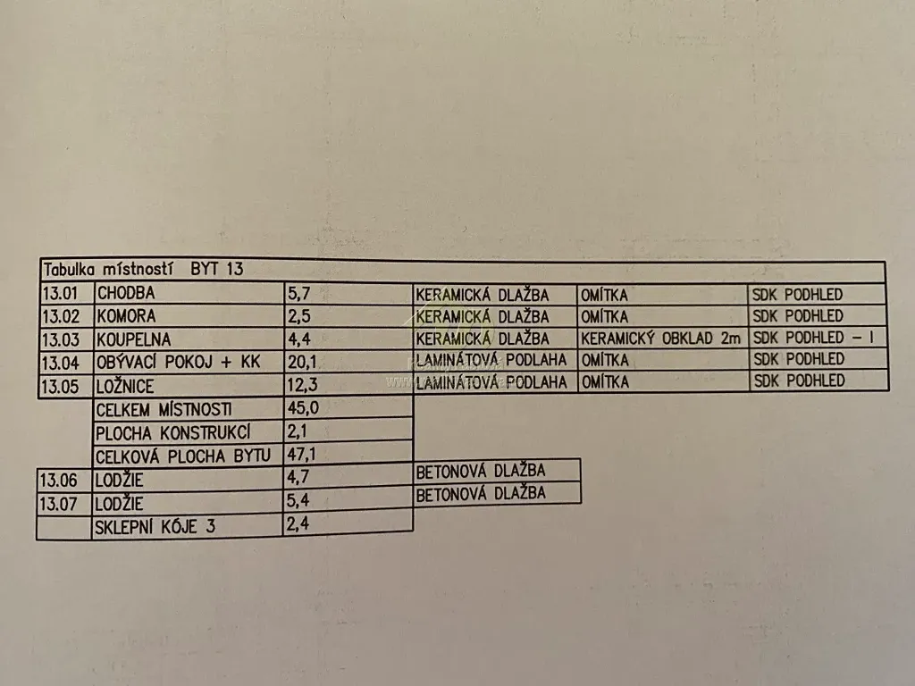 Skládá se z obývacího pokoje s kuchyňksým koutem, kde je k dispozici kuch.linka zhotovená na míru vč. dřezu, indukční desky na vaření, el.trouby a digestoře. Obývací pokoj je plně prosklen a s výstupem na lodžii. Dále samostatný pokoj s lodžií. Na každou lodžii je vyvedena elektřina – osvětlení a zásuvky, s krásným výhledem do okolí. Dále má byt koupelnu s vanou, umyvadlem a toaletou a komoru v bytě. Na chodbě domu naproti bytu je další komora (sklep) o vel.2,4 m2. Jinak je byt nabízen bez nábytku. Pro větší bezpečí je byt opatřen kamerovým domovním zvonkem a světlem na čidlo v předsíni bytu.
