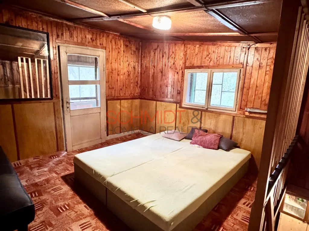 Patrová chata se nachází na pozemku o zastavěné ploše 42 m². Přízemí nabízí nově vybudovanou verandu a dále kuchyni společnou s obývacím pokojem. První podlaží poté ložnici s dvojlůžkem a gaučem. Koupelna se sprchovým koutem a toaletou je stejně jako kuchyňská linka napojená na studniční užitkovou vodu, jejíž ohřev zajišťuje téměř nový elektrický bojler. K vytápění v koupelně slouží elektrický přímotop, v chatě jsou to krbová kamna. Užitná plocha obou podlaží - cca 72 m².
