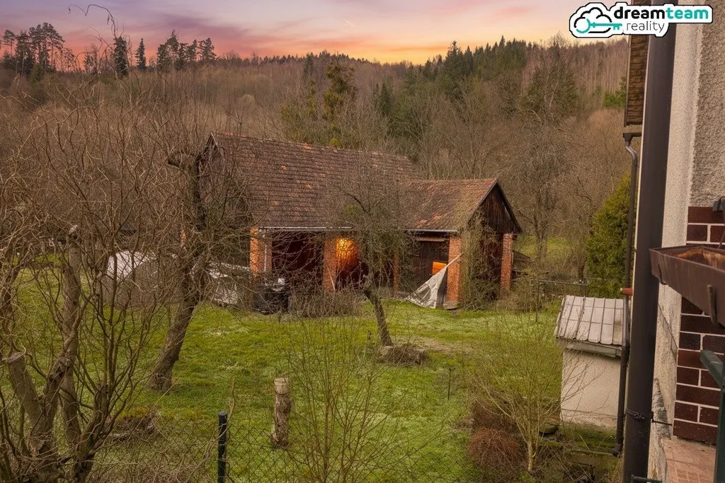 Stodola, zahrada a přehrada za rohem.