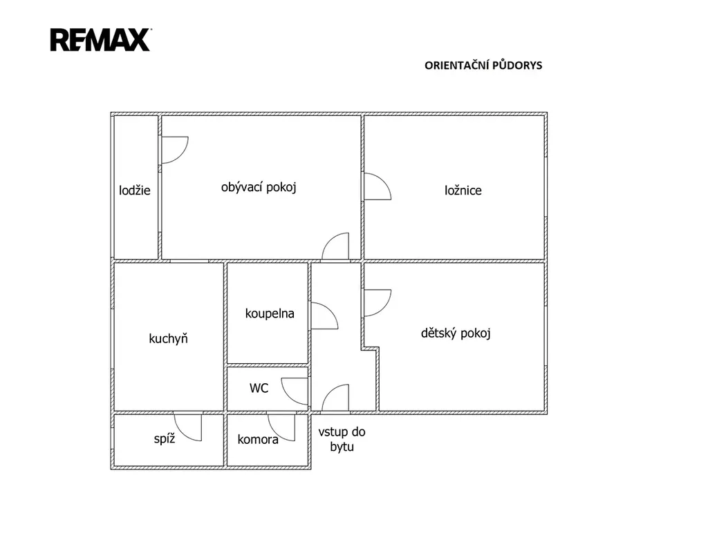 Dispozice bytu: vstupní chodba s vestavěnou skříní, dětský pokoj, ložnice, koupelna s vanou, WC, komora, obývací pokoj se vstupem na lodžii, kuchyň, spíž/technická místnost.