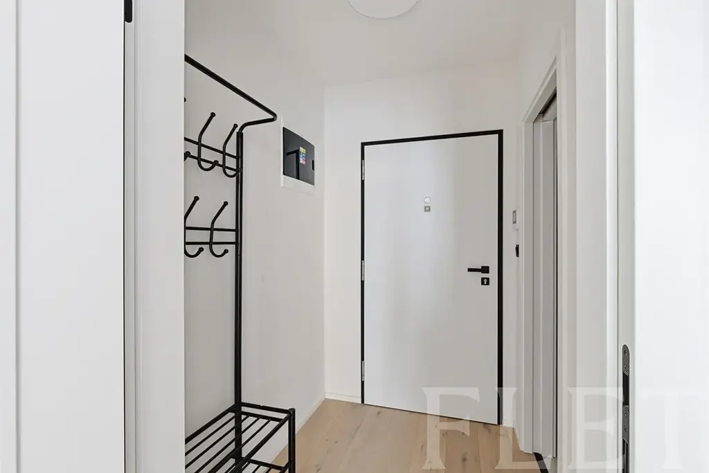 Interiér nabízí efektivně využitý prostor s obývací částí a plně vybaveným kuchyňským koutem. Ten disponuje vestavnými spotřebiči – varnou deskou, troubou, digestoří, mikrovlnnou troubou i lednicí s mrazákem, nechybí ani vestavná pračka. V koupelně je sprchový kout, toaleta a elektrické odvětrávání. Praktická předsíň se skříní poskytuje dostatek úložného prostoru. Velkým benefitem je také balkon o velikosti 3 m², ideální pro ranní kávu či večerní relax.
