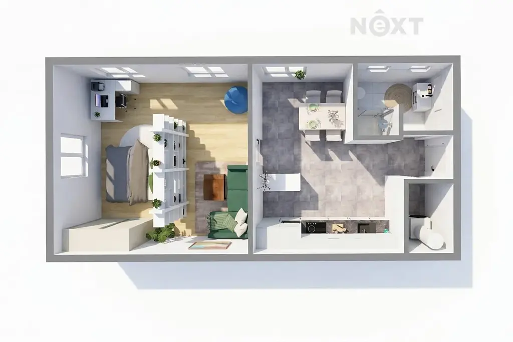 Dispozice 1+1 nabízí díky své velikosti dostatek prostoru jak pro vlastní bydlení, tak i jako investici k pronájmu. Měsíční náklady nepřesahují 4 000 Kč.