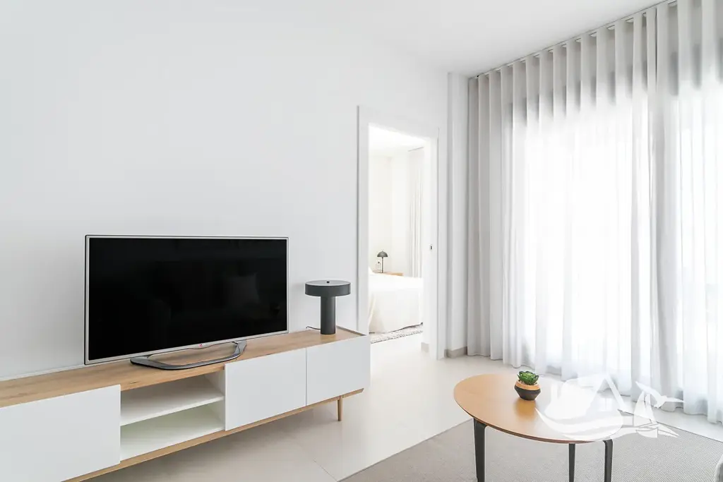 Dispozice se třemi ložnicemi a dvěma koupelnami je rozložena na dvou podlažích a nabízí zastavěnou plochu přibližně 96 m². Hlavním benefitem je ale solárium o velikosti více než 127 m², které otevírá úplně jiný způsob života. Ranní snídaně na slunci, odpolední relax s výhledem na město a večery s přáteli pod širým nebem se tady stanou běžnou součástí dne. Krytá terasa o velikosti téměř 39 m² přirozeně navazuje na obytný prostor a propojuje interiér s exteriérem tak, jak to ve Španělsku dává smysl.