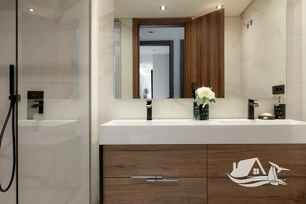 Interiér je navržen s důrazem na jednoduchou eleganci a funkčnost. Otevřený obývací prostor s kuchyní přirozeně navazuje na terasu a vytváří vzdušné prostředí plné světla. Kuchyň s poloostrovem je plně vybavena moderními spotřebiči a doplněna praktickými detaily, které oceníte při každodenním fungování. Vestavěné skříně, porcelánové podlahy a interiérové prvky v dekoru ořechu dodávají prostoru teplo a nadčasový charakter.