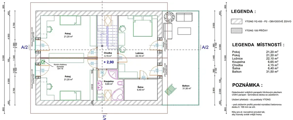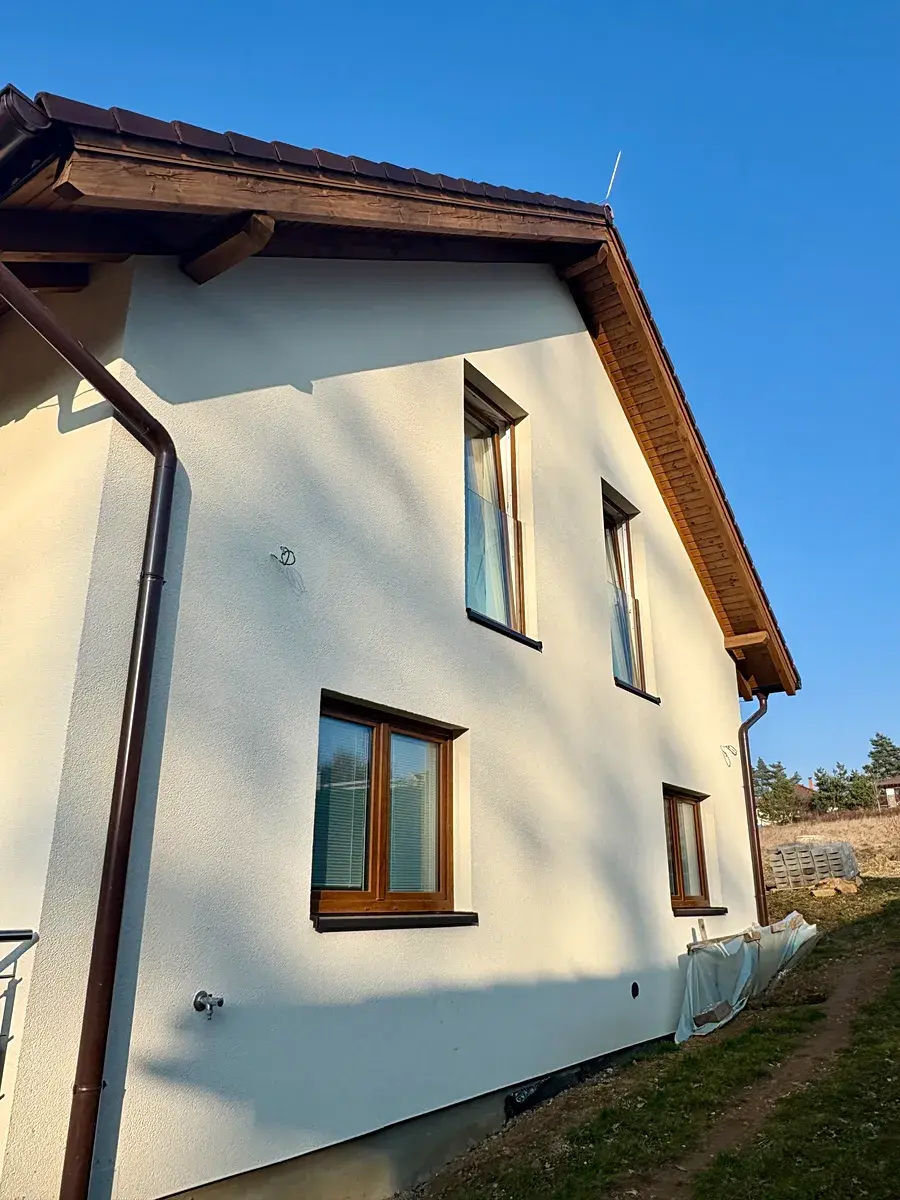 Dům je zděný z tvárnic Porfix premium s další vnější izolací 15 cm a střešní krytina je z betonových tašek. Okna jsou plastová 5ti komorová s trojskly a mají vnitřní barvu bílou a vnější s fólií v barvě dřeva. Vstupní dveře i sekční garážová vrata jsou také z plastu v barvě dřeva. V celém domě je elektrické podlahové vytápění a také radiátory napojené jak na elektrokotel tak na krbovou vložku s výměníkem umístěnou v obývacím pokoji. Ve výměníku se ohřívá nejen vodu v radiátorech, ale také v bojleru. Stropy jsou ze sádrokartonu a ložnice v podkroví mají dřevěnými palubkami obložené šikmé plochy. Podlahy jsou plovoucí s dekorem dřeva, v koupelnách je kvalitní a stylová dlažba a sanita. Vnitřní dveře jsou obložkové s dekorem světlého dřeva. Dům má hotovou finální fasádu ze tří stran. Na terasách je položená dlažba a vnitřní i vnější zábradlí je z nerezu.