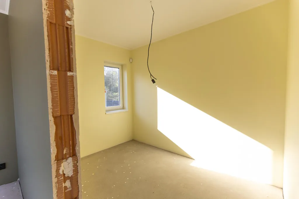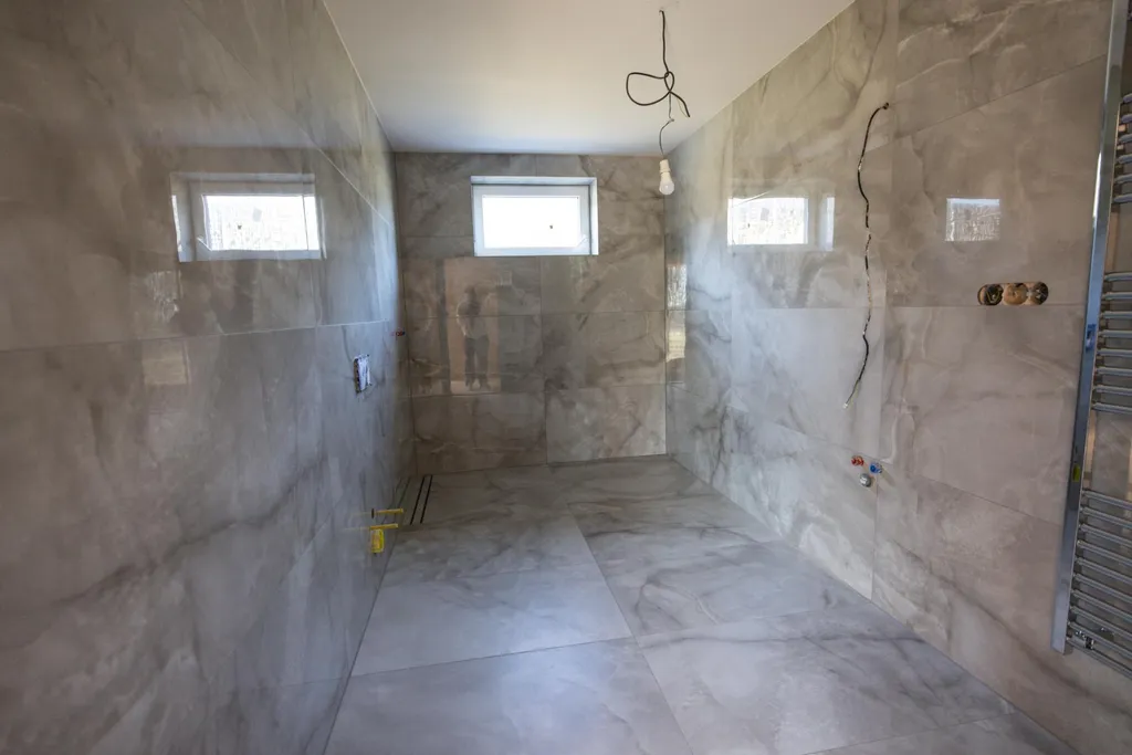 Dům je ve finální fázi svého dokončení. Pro důstojné bydlení stačí dodělat podlahy, kuchyňskou linku, obložky dveří a koupelnové příslušenství. V pozdější fázi bude nutné realizovat také fasádu nemovitosti. Koupelny jsou částečně obložené velkoformátovými obklady, v některých částech domu je již položená podlahová dlažba. U oken jsou zavedeny přípravy na předokenní žaluzie.