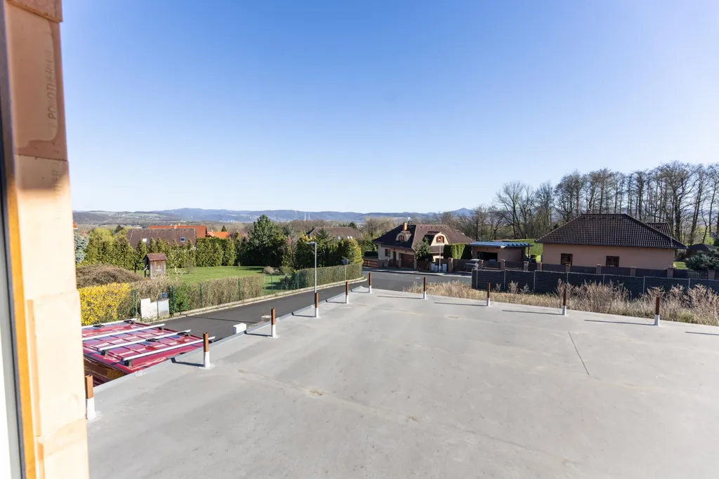 V horním patře nemovitosti najdete druhý koupelný prostor a 2 separátní pokoje, které mají vstup na druhou, horní terasu. Jeden z pokojů je vhodný pro děti, druhý pokoj může sloužit jako velká ložnice s vlastní šatnou. V objektu naleznete všechny potřebné inženýrské sítě, tedy vodu, elektřinu a plyn. Dům je vytápěný tepelným čerpadlem a v celém objektu je zavedené moderní podlahové topení.