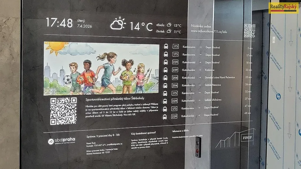 Dům je moderně provedený, ve vstupní hale on-line nástěnka (info desk), bezbariérový přístup, kolaudace 2026, parkování na ulici.
