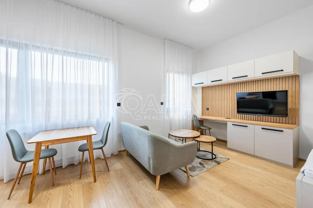 Byt ve vysokém standardu je pronajímán kompletně vybavený. Kuchyňská linka s vestavěnými spotřebiči (indukční varná deska, horkovzdušná trouba, mikrovlnná trouba, digestoř, lednice, mrazák, myčka, varná konvice) jídelní stůl s židlemi, manželská postel, sedací souprava, konferenční stolek, smart TV, skříně a police, pracovní stůl s židlí, v chodbě vestavěná skříň, v koupelně pračka a sušička. Byt je klimatizovaný.