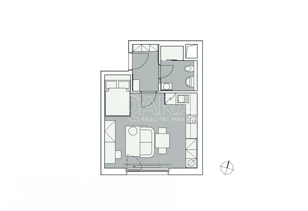 Dispozice bytu zahrnuje vstupní chodbu, obývací prostor s kuchyní a manželskou postelí, koupelna se sprchovým koutem a toaletou.