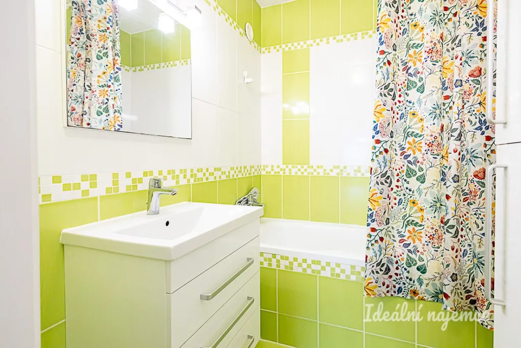 Koupelna je vybavena vanou, umyvadlem a zrcadlovou skříňkou. Toaleta je samostatná. V předsíni se nachází další velká šatní skříň a k bytu náleží také praktický sklep.