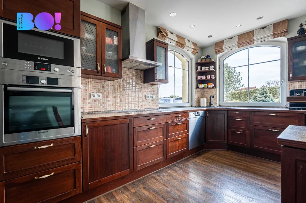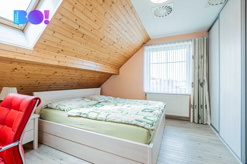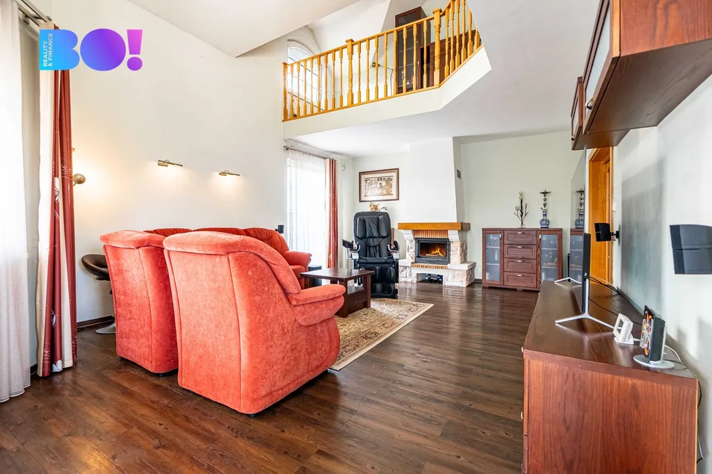 Samotný dům o dispozici 5+kk nabízí obytnou plochu 225 m² a už při vstupu působí velmi příjemně. Interiér je řešen s důrazem na dostatek prostoru, světla a pohodlí, což podtrhuje zejména obývací pokoj se stropem vysokým až 5,5 m, který domu dodává otevřenost a vzdušnost. Celkovou atmosféru navíc umocňuje krb, jenž interiéru propůjčuje útulnost, zatímco prostorné pokoje zvyšují komfort každodenního bydlení.