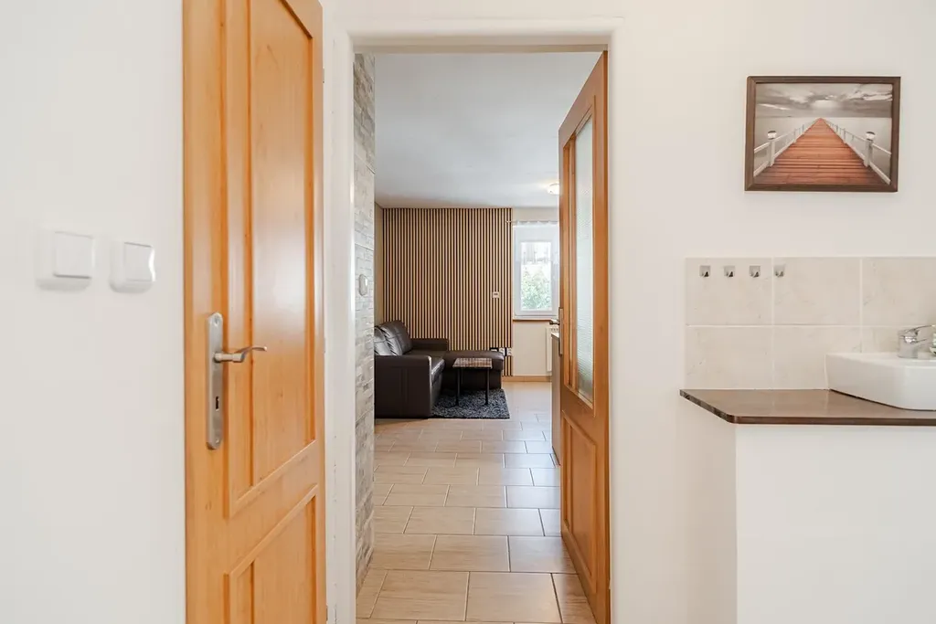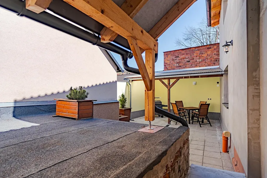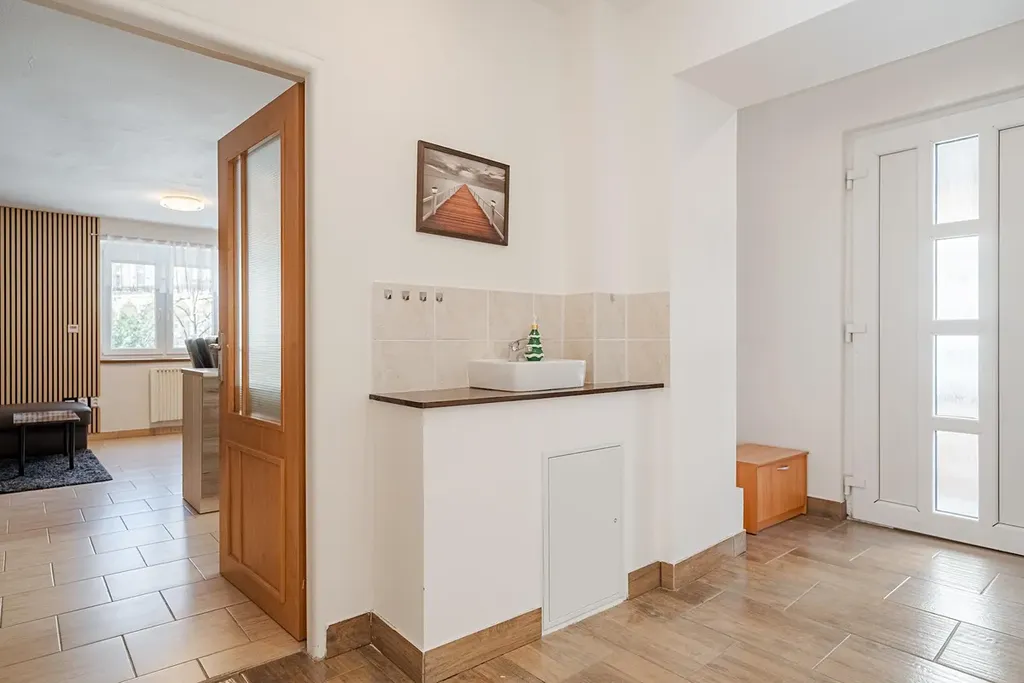 Exkluzivně nabízíme k prodeji rodinný dům v Brandýse nad Orlicí, v klidné části Podzámčí. Nemovitost stojí na pozemcích o celkové výměře 217 m², přičemž zastavěná plocha a nádvoří činí cca 178 m². Dispozice: Po vstupu do domu se po levé straně nachází prostorná garáž. Po schodišti se dostaneme do hlavní obytné části domu. Před vstupem je příjemný venkovní prostor k posezení, na který navazuje samotný vstup do interiéru. Zde vstupujeme do hlavní chodby, odkud se dům logicky otevírá do jednotlivých částí. Po levé straně je samostatná místnost, která v minulosti sloužila k podnikání a může být ideální jako pracovna, atelier, kancelář, provozovna služeb nebo pokoj navíc. Po pravé straně se nachází bytová část, kde je obývací pokoj propojený s kuchyní, dále ložnice a koupelna. Na chodbě je také samostatná toaleta a vstup ven na další venkovní část domu. Velkým bonusem nemovitosti je podkroví, kde byla připravena vestavba pro další obytný prostor. V tuto chvíli je prostor nachystán na tři místnosti a koupelna, přičemž pro dokončení je potřeba zejména dodělat podlahy a finální povrchy. Rozvody elektroinstalace, vody a kanalizace jsou vyvedeny stoupačkou do podkroví. Právě tato část domu dává novému majiteli možnost snadno rozšířit současnou dispozici a přizpůsobit si horní patro podle vlastních potřeb. Součástí domu jsou také sklepy o výměře cca 40 m², které prošly v roce 2024 kompletní úpravou. Odvětrávané podlahy a systémy cirkulace vzduchu zajišťují suché suterénní prostory, které jsou připraveny pro zřízení dílny, skladu nebo technického zázemí. Dům prošel v uplynulých letech postupnou rekonstrukcí. V letech 2014 až 2017 byly řešeny základní technické části domu, včetně rozvodů vody, elektřiny a odpadů. V roce 2022 navázala významná stavební etapa, při které byla realizována nová střecha z betonové tašky Bramac Max. Její konstrukci tvoří masivní krovy přesně opracované na CNC stroji. Součástí prací byly úpravy horní části domu, příprava podkrovních prostor a částečné zateplení, které bylo dokončeno v roce 2024. V témže roce byly hotovy také zmíněné sklepy a v roce 2025 se rozběhly práce na dvoře. Brandýs nad Orlicí je známý svým klidným prostředím, výbornou dopravní dostupností a také rehabilitačním ústavem s dlouholetou tradicí, který se nachází v přírodním prostředí Přírodního parku Orlice. Město leží na hlavní železniční trati Praha – Česká Třebová a v dosahu je také základní i mateřská škola, což z něj dělá příjemné místo pro každodenní život. Lokalita Podzámčí působí klidně a díky blízkosti lázeňského a rehabilitačního areálu může být zajímavá jak pro rodinné bydlení, tak i pro drobné podnikání nebo služby. Nemovitost je vhodná pro klienta, který hledá dům s charakterem, možností dalšího rozšíření a zároveň s potenciálem pro kombinaci soukromého bydlení a podnikání. U nemovitosti aktuálně probíhá přeměření v rámci katastru nemovitostí, takže uvedené rozměry se mohou ještě mírně změnit. Dvě z prvních čtyř fotografií jsou vizualizace možné podoby fasády domu. Pro více informací a termín prohlídky mě neváhejte kontaktovat.