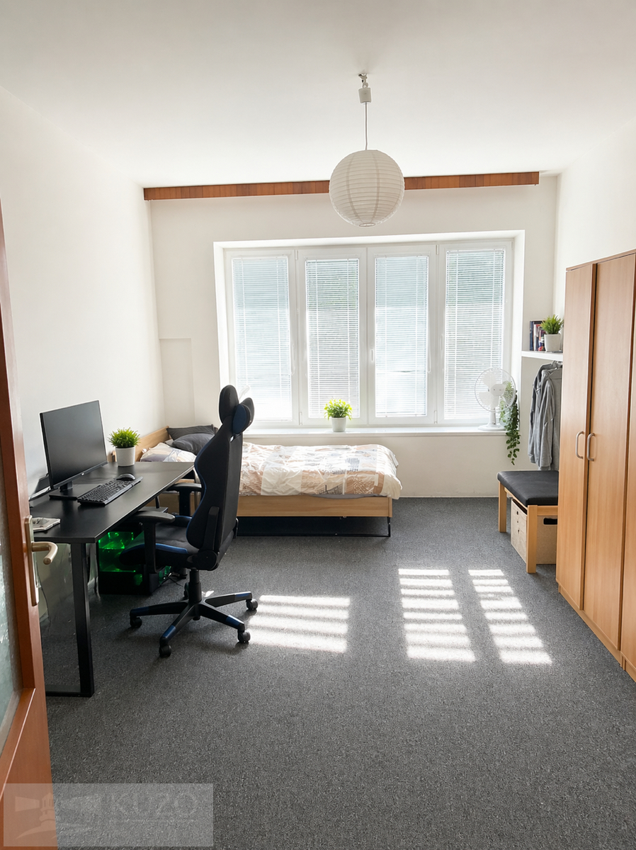 Byt je ideální pro skupinu 4–6 studentů a sestává ze čtyř neprůchozích pokojů a jednoho středového pokoje, který slouží jako společenská místnost. Dále je k dispozici samostatná kuchyně, koupelna s vanou a pračkou, samostatné WC a balkon (viz půdorys). K bytu nenáleží sklep.