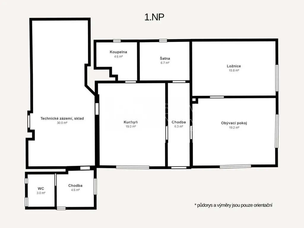 Dominantou domu je prostorná kuchyň (cca 19 m2) a světlý obývací pokoj (cca 19,2 m2), které tvoří přirozené centrum každodenního života. Dále je k dispozici ložnice (cca 15,8 m2), dva samostatné pokoje (cca 14,2 m2 a 10,6 m2), koupelna, samostatné wc, šatna, technické a skladovací zázemí.