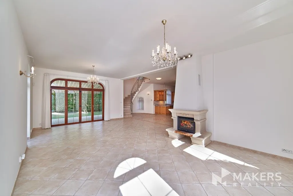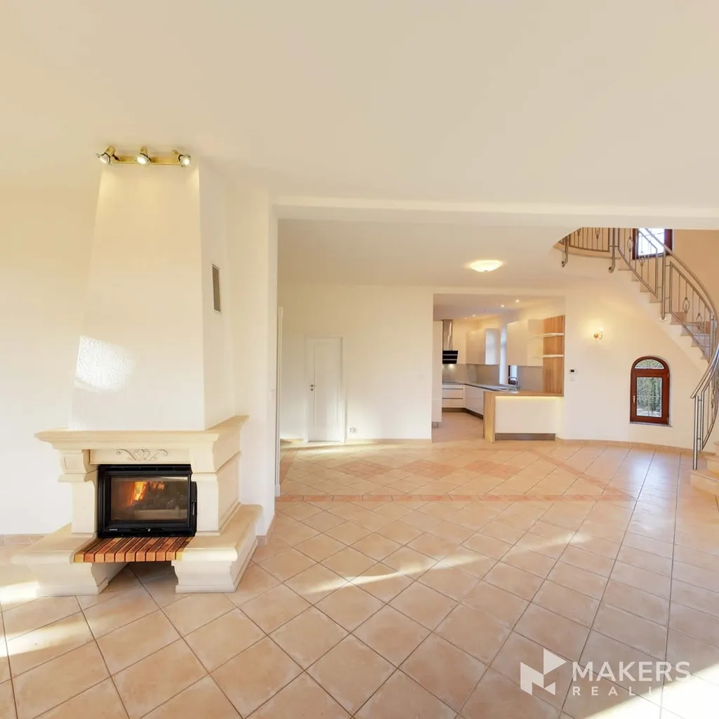 Kuchyňská linka je plně vybavena spotřebiči, jako je sklokeramická varná deska, horkovzdušná trouba, myčka nádobí, lednice s mrazákem a digestoř. Otevřený obytný prostor plynule propojuje kuchyň s obývacím pokojem, který nabízí krb a přímý vstup na zahradu.
