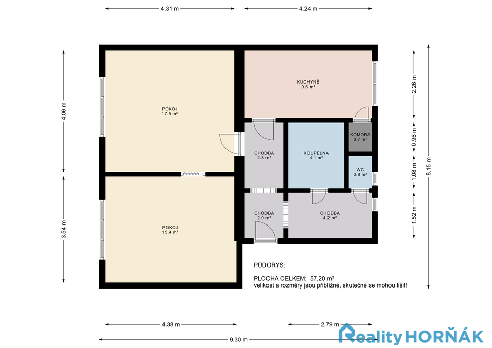 Byt nabízí místnosti vstupní chodby (3,75 x 1,26 = 4,73 m²), chodbičky (2,84 x 1,46 = 4,15 m²), kuchyně (4,22 x 2,39 = 10,09 m²) s navazující spíží (0,86 x 0,98 = 0,84 m²), obývacího pokoje (4,16 x 4,12 = 17,14 m²) a ložnice (3,44 x 4,19 = 14,41 m²). Dispozici bytu doplňuje koupelna (1,78 x 1,90 = 3,38 m²) a samostatné WC (0,90 x 1,02 = 0,92 m²). K bytu jsou užívány dva zděné sklepy v suterénu domu.