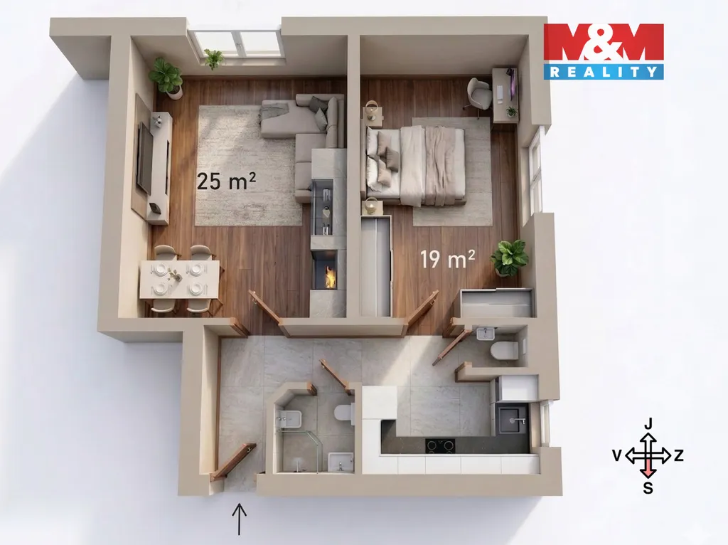 Okna jsou orientována na jih a západ. Pokoje 25 m2 a 19 m2, kuchyně 5,4 m2, předsíň 4,8 m2, koupelna 2,8 m2, WC 1,2 m2, sklep 5 m2.
