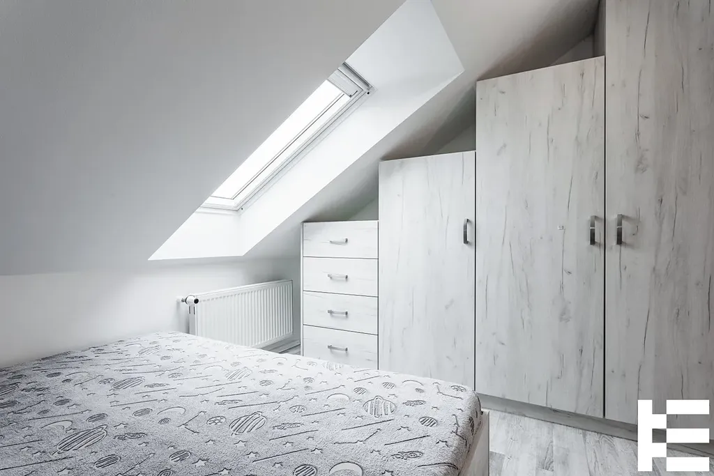Ložnice: Vaše soukromá oáza klidu se zabudovanými skříněmi, které chytře využívají podkrovní prostory.