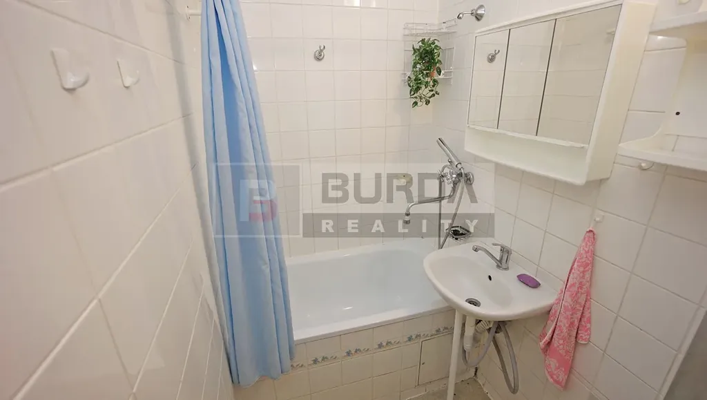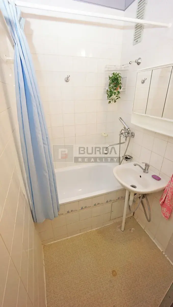 Bytové jádro je původní, obložené keramickým obkladem. Koupelna je vybavena vanou, umyvadlem, skříňkou se zrcadlem a přípojkami pro pračku.