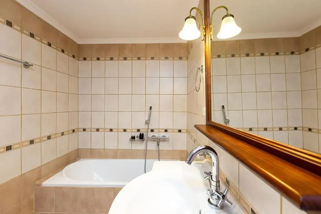 Zbylá dvě patra jsou hlavní obytný prostor. V 1. patře je kuchyně s obývacím pokojem s krbem, WC, 1 ložnice s vlastní koupelnou a balkon.