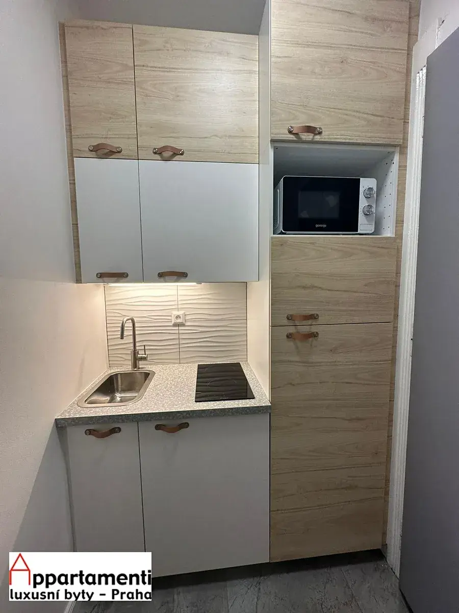 Na pronájem zařízené útulné garsonky (1KK), 26m2 ve 2 patře udržovaného domu, v bytě je malá kuchyňka, pračka, koupelna se sprchovým koutem a toaleou